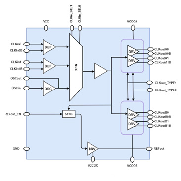The input clock can be selected from two universal differential or single-ended inputs, or one crystal input which can be overdriven by external single-ended clock. Crystal input frequencies from 8MHz to 50MHz are supported.