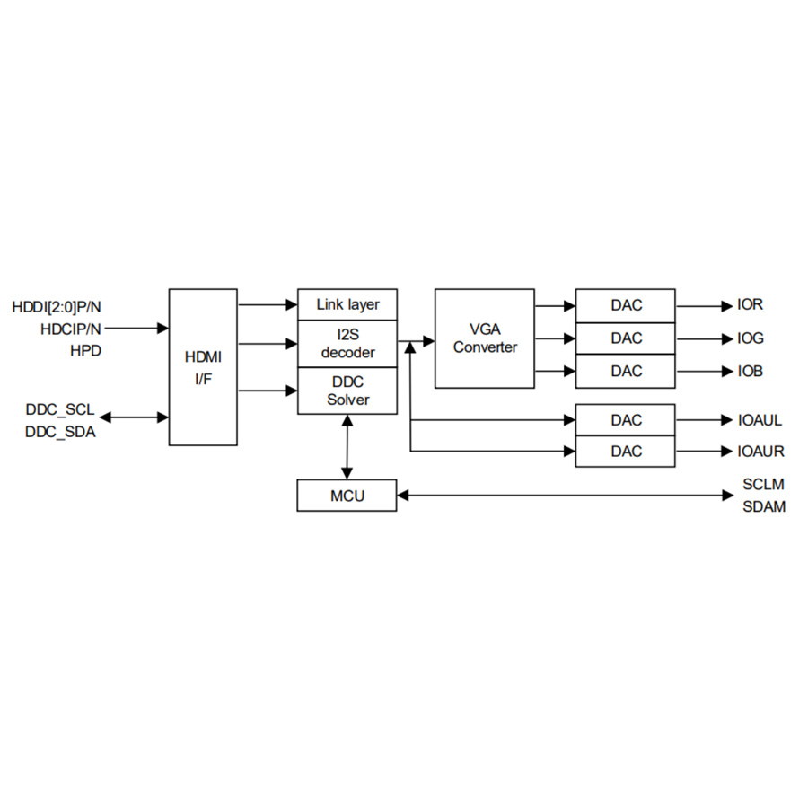 NCS8821 is a low-cost, low-power, the HDMI1.4 high resolution video to VGA converter. It consists of HDMI receiver, three separate 10-bit video Digital-to-Analog Converters (DACs) and audio encoder. This is a single-chip solution for HDMI to VGA adapter, Docking station and etc. The HDMI receiver is compliant with HDMI 1.4a specification. The VGA output can support up to WUXGA (1920*1200 CVTRB@ 60Hz). The 4mm*4mmQFN32 package can save the PCB spaces.